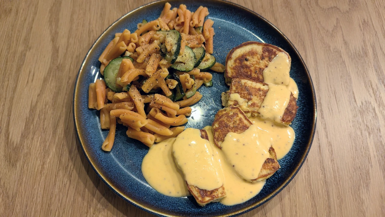 Breaded tofu in a herb and Parmesan crust with red lentil pasta and zucchini (🧀)