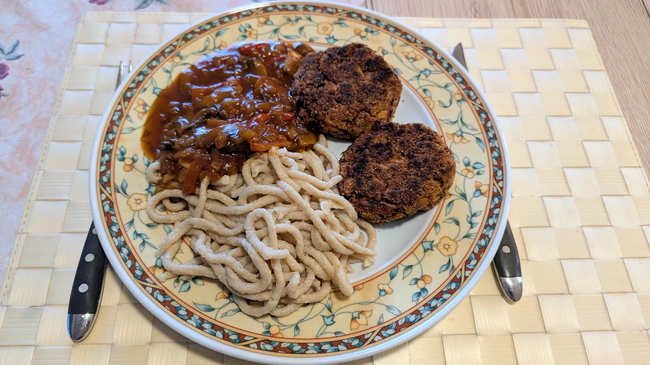 Veggie meatballs with bell pepper sauce and Spätzle (🧀)