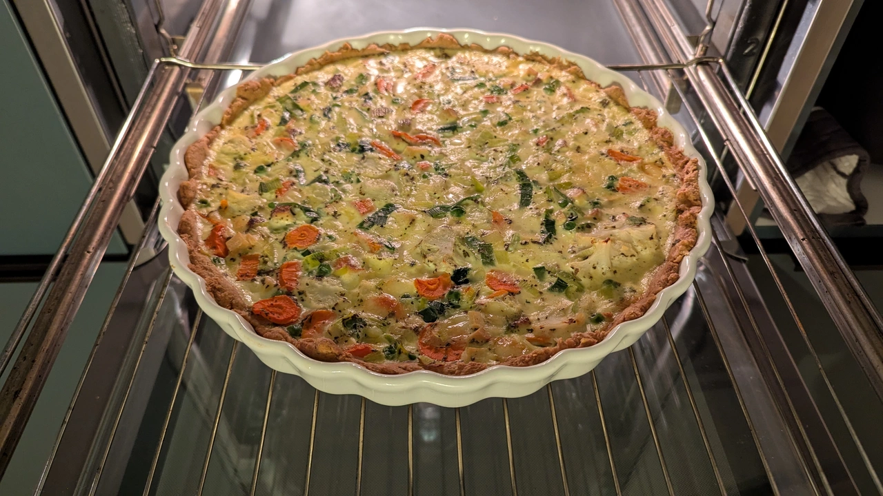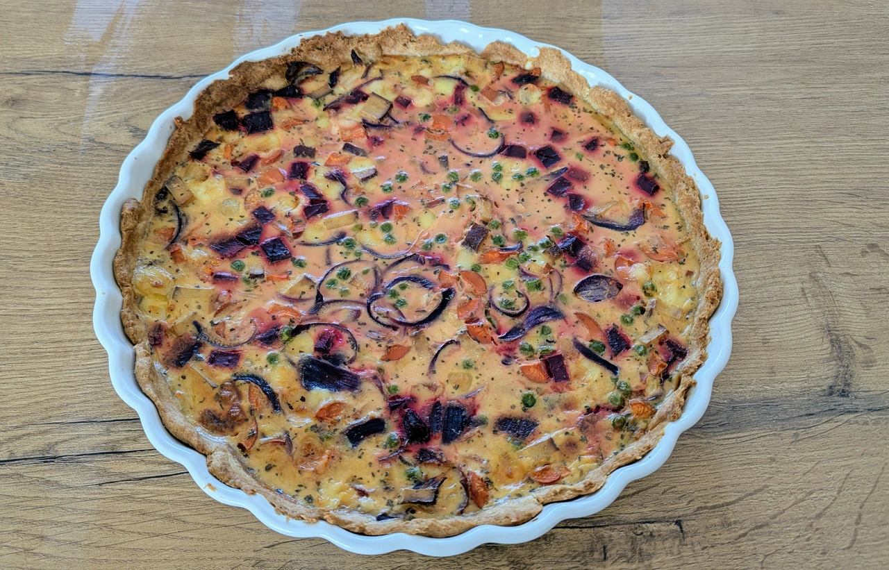 Raclette quiche with beets, peas, and smoked tofu (🧀)