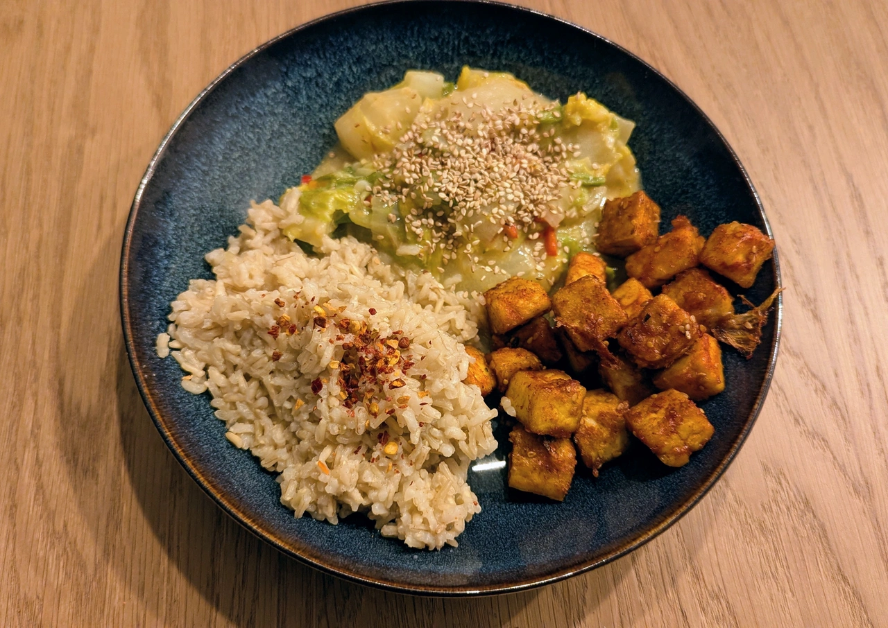 Spicy gochujang tofu with napa cabbage and brown rice (🌱)