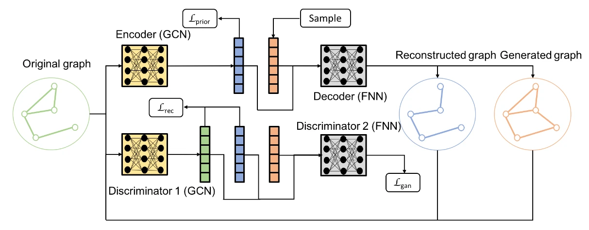 CondGen [8] tackles the problem by essentially replacing the reconstruction loss with a discriminator loss. Inspired by architecture of generative adversarial networks (GAN), they train a discriminator network in addition the encoder and decoder that is tasked to distinguish between real and generated data samples. During training, it inherently learns to map isomorphic graph structures to identical (or at least very similar) latent vectors in a permutation-invariant manner. The reconstruction loss is then simply computed as the Euclidean distance between the discriminator’s latent embeddings of and . In some sense, what CondGen proposes is a VAE architecture “wrapped” by a GAN architecture.